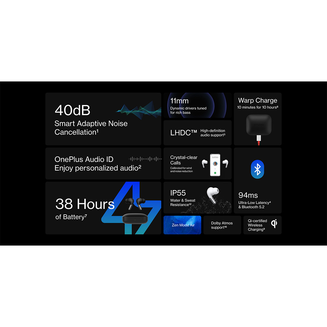 Battery: Charging interface (for charging case), Wireless, Qi-certified, Playtime (when fully charged), Playback with ANC ON: Up to 5 hours, Playback with ANC OFF: Up to 7 hours, Phone call Up to 3 hours (phone call), Combined playback: Up to 28 hours (ANC ON), 38 hours (ANC OFF), Warp charge, 10 mins for 10 hours (charging case + earbuds combined)
